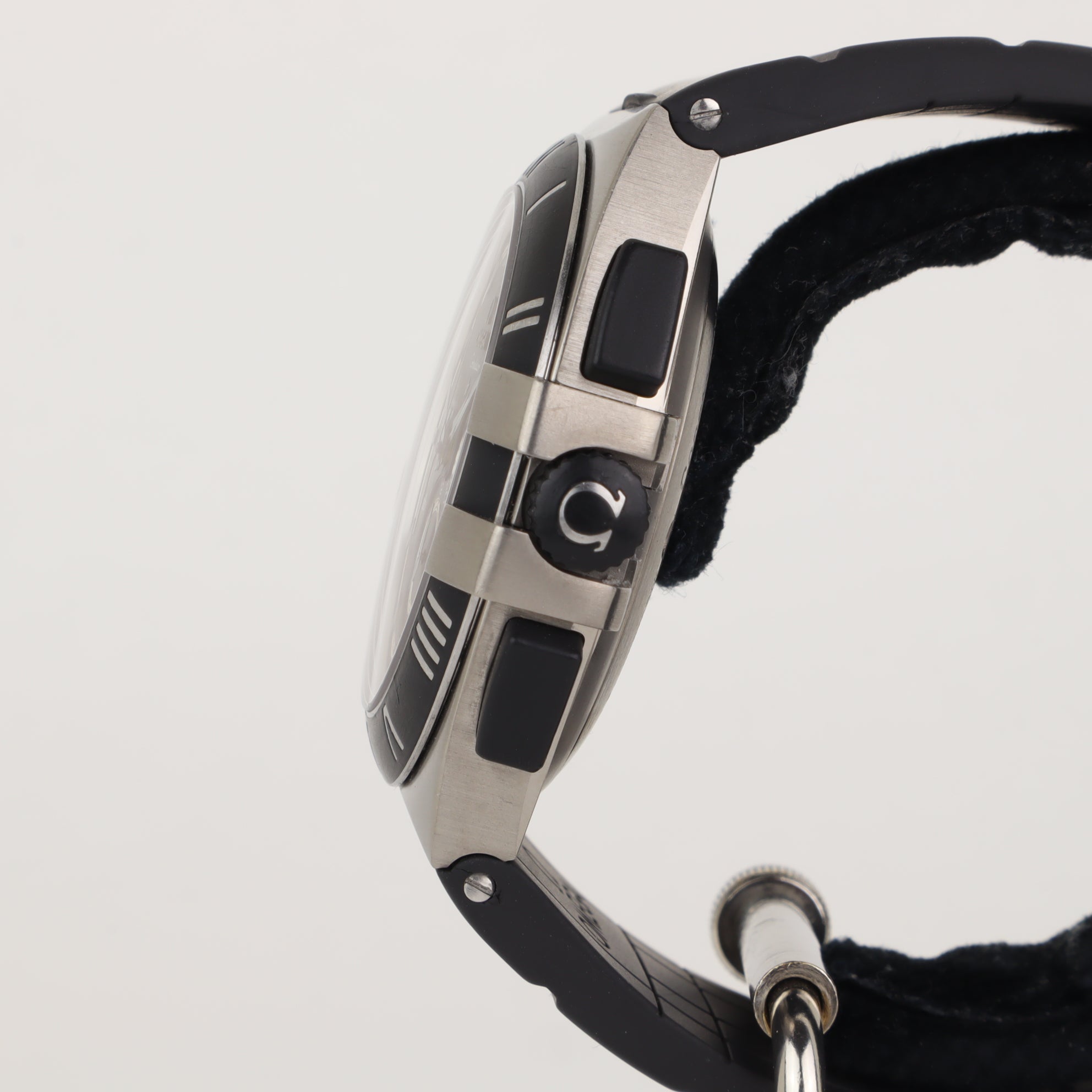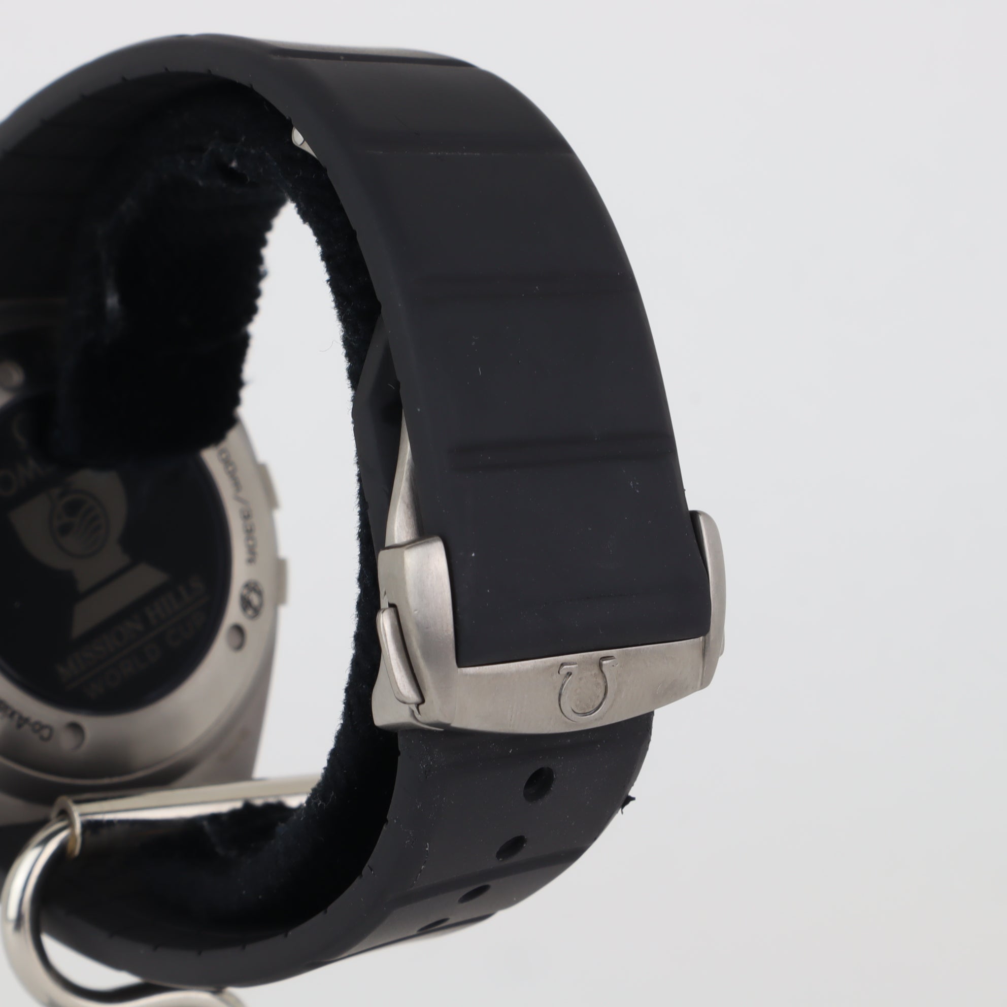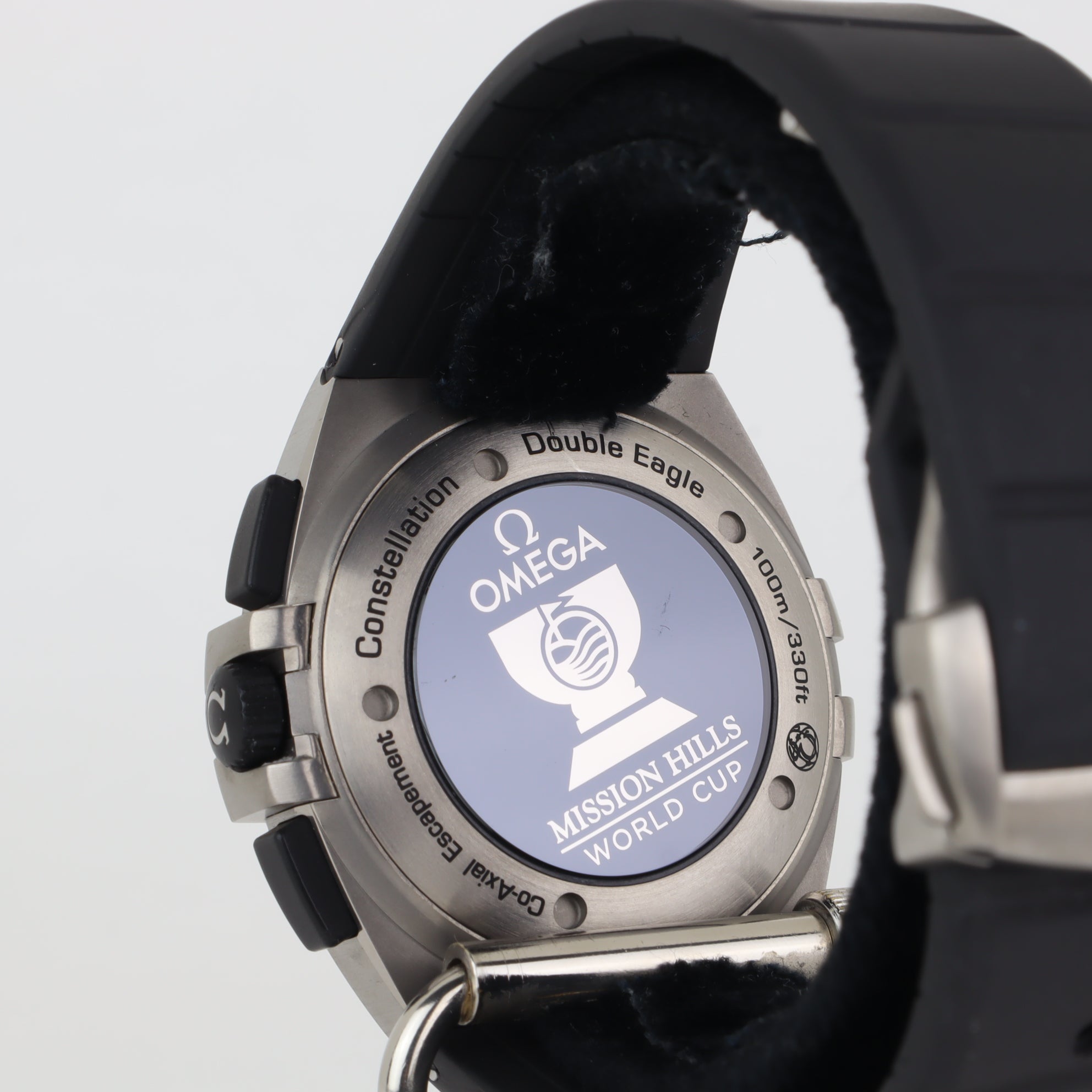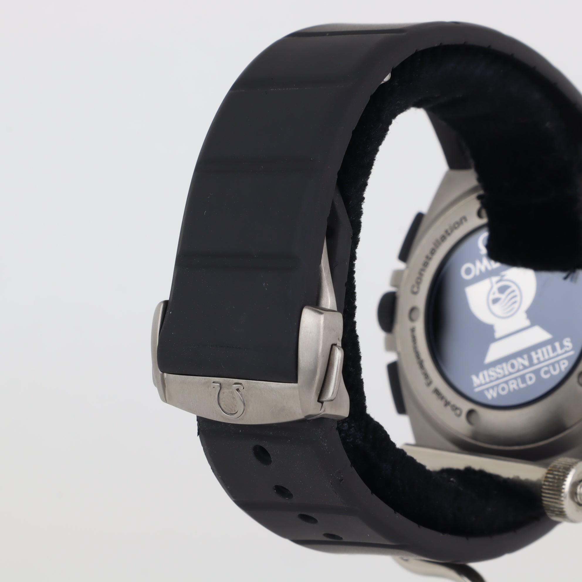 This Omega Constellation with reference number 121.92.41.50.01.001 features a case made of titanium with a diameter of 41mm excluding the crown. The bracelet is made of rubber and has a titanium clasp. The production year of the watch is unknown. As can be seen in the photos the watch remains in very good condition. The movement in this watch is automatic. The scope of delivery includes the watch only. As with all of our watches, condition is key. This one is in really nice condition, without too many marks. Runs perfectly. Mission Hills World Cup Tournament on glass caseback.