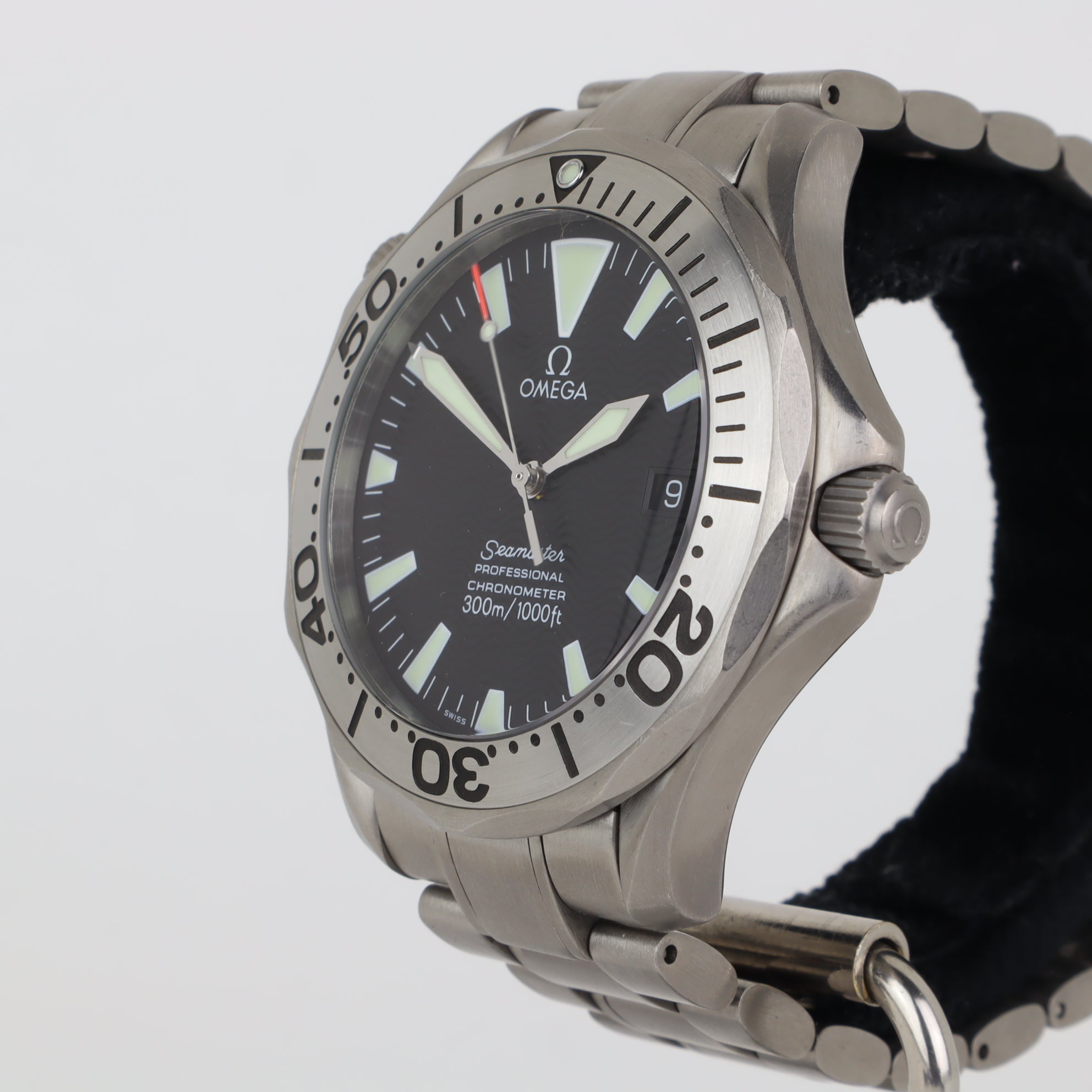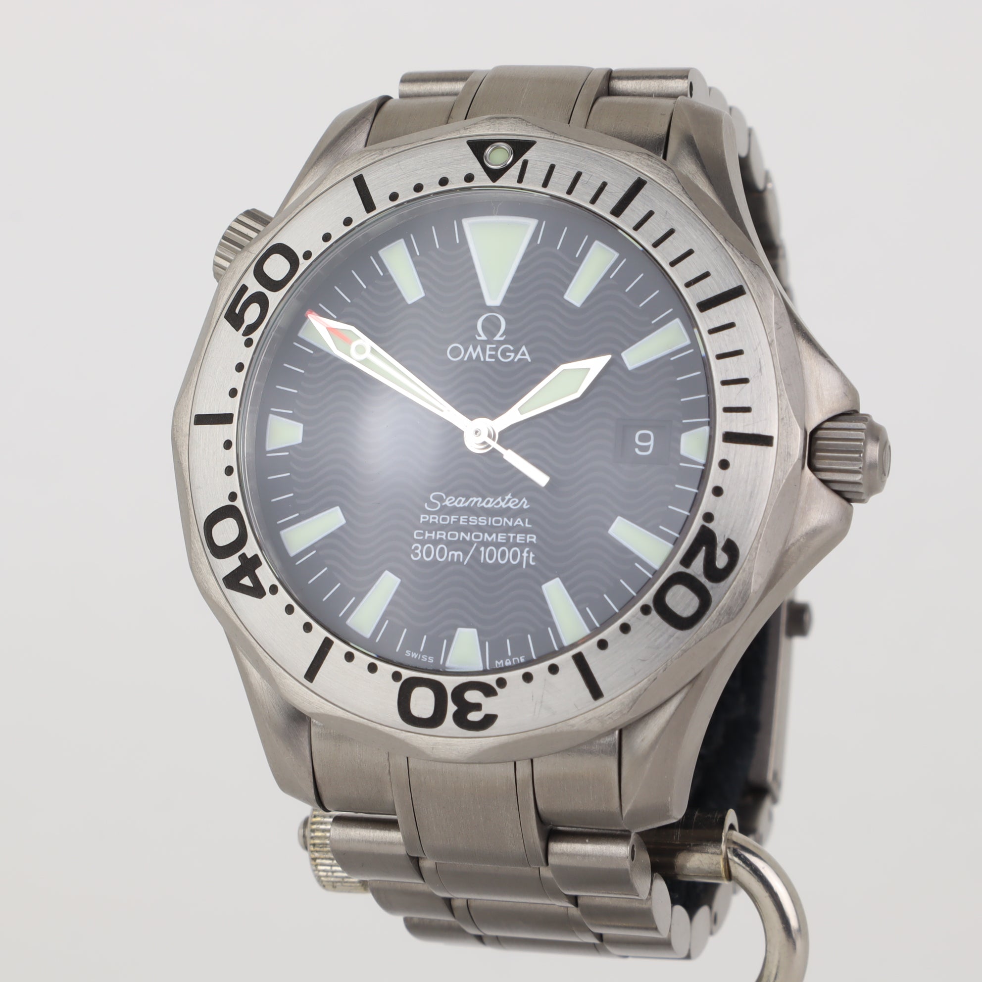 This Omega Seamaster 300M with reference number 2231.50 features a case made of titanium with a diameter of 41mm excluding the crown. The bracelet is made of titanium and has a titanium clasp. The production year of the watch is 2006. As can be seen in the photos the watch remains in very good condition. The movement in this watch is automatic. The scope of delivery includes the watch only. Year approximated from serial number starting with 32. Pressure tested with receipt. Cool 300M in titanium and black dial.