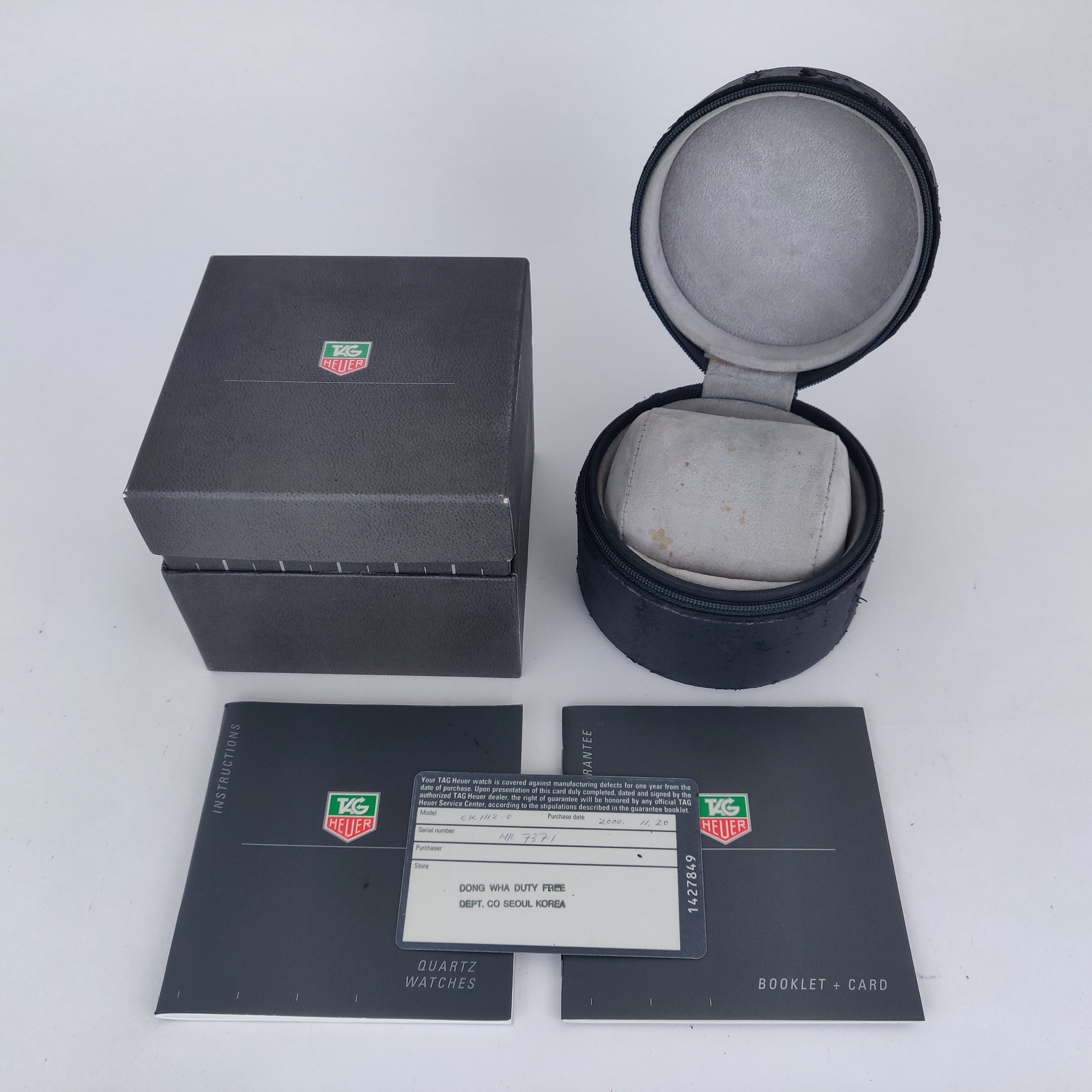 This TAG Heuer 2000 Chronograph with reference number CK1112-0 features a case made of steel with a diameter of 38mm excluding the crown. The bracelet is made of steel and has a steel clasp. The production year of the watch is 2000. As can be seen in the photos the watch remains in very good condition. The movement in this watch is quartz. The scope of delivery includes the original box and original papers. Very nice example of this reference, sharp, near new. Sold 20th of November, year 2000 in Seoul, South Korea. Just serviced by TAG Heuer certified watchmaker with receipt for €300. Pressure tested with receipt.