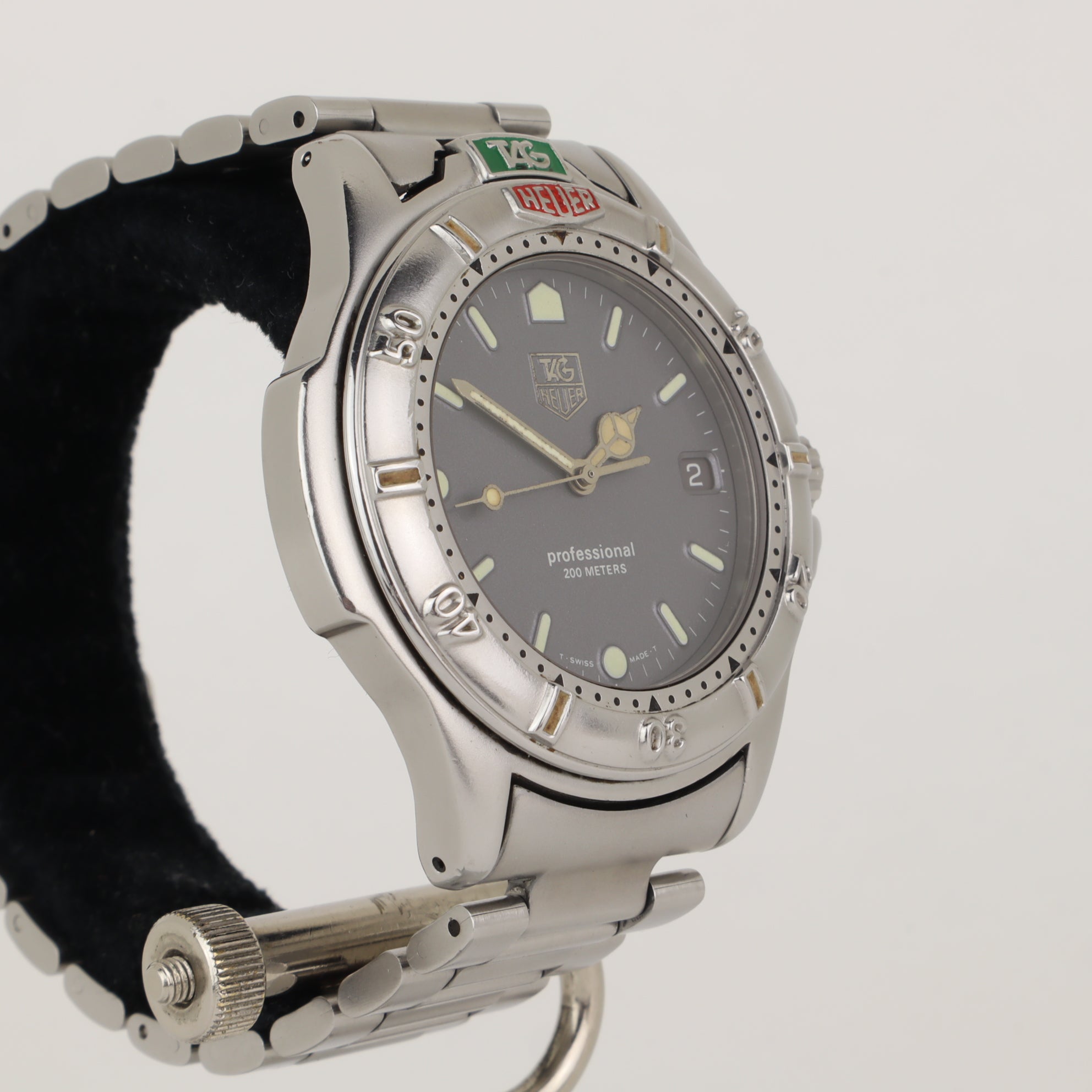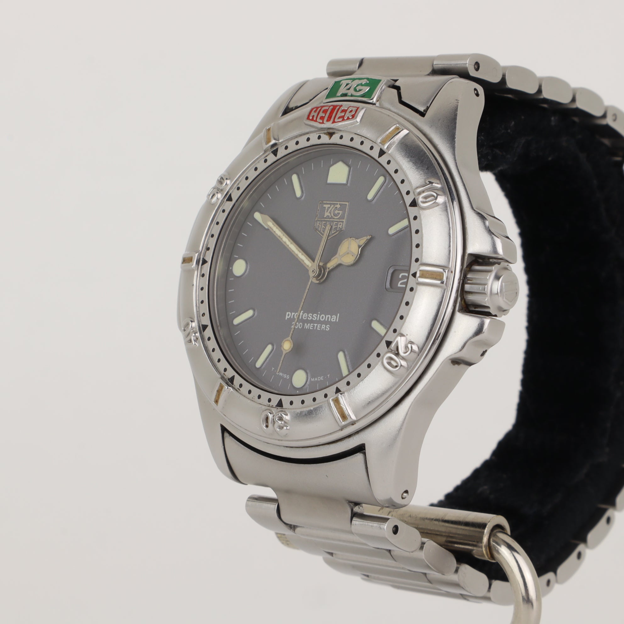 This TAG Heuer 4000 with reference number 999.206A features a case made of steel with a diameter of 38mm excluding the crown. The bracelet is made of steel and has a steel clasp. The production year of the watch is unknown. As can be seen in the photos the watch remains in very good condition. The movement in this watch is quartz. The scope of delivery includes the watch only. Cool 90s TAG diver with great contrasting colours.